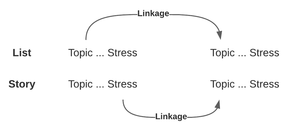 This is the crucial aspect contributing to a page turner. For the first time, I learned the difference between a list of sentences and a story. The difference is shown in the below figure adapted from Figure 13.2 of the book.